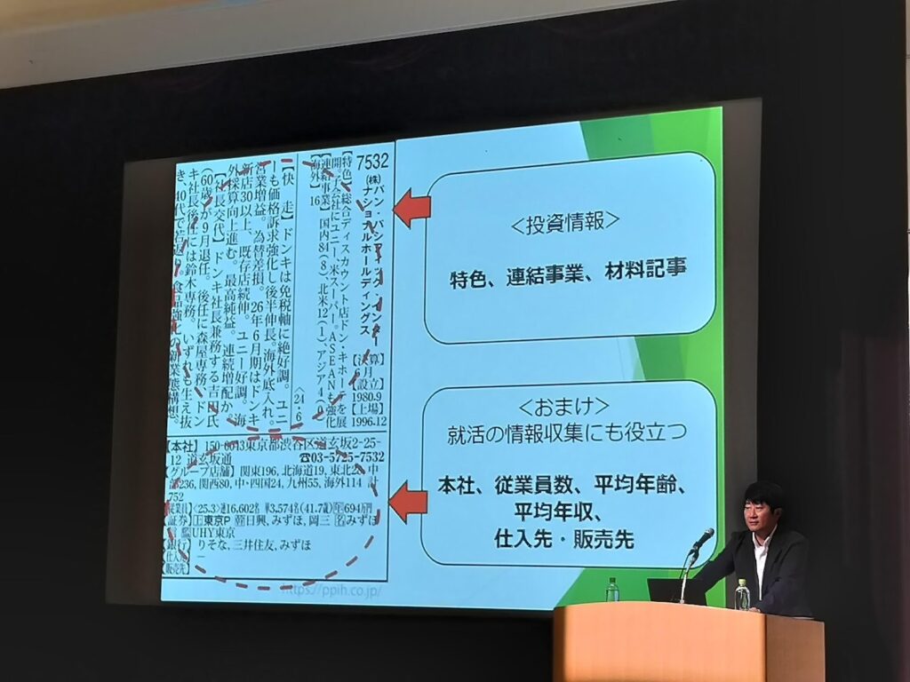 日経新聞だけでなく、企業の情報を収集するときに役立つ「四季報」の見方も解説。実際に証券会社の営業員として、現場で活躍している石山氏だからこそ話せる、有意義なセミナーでした。
