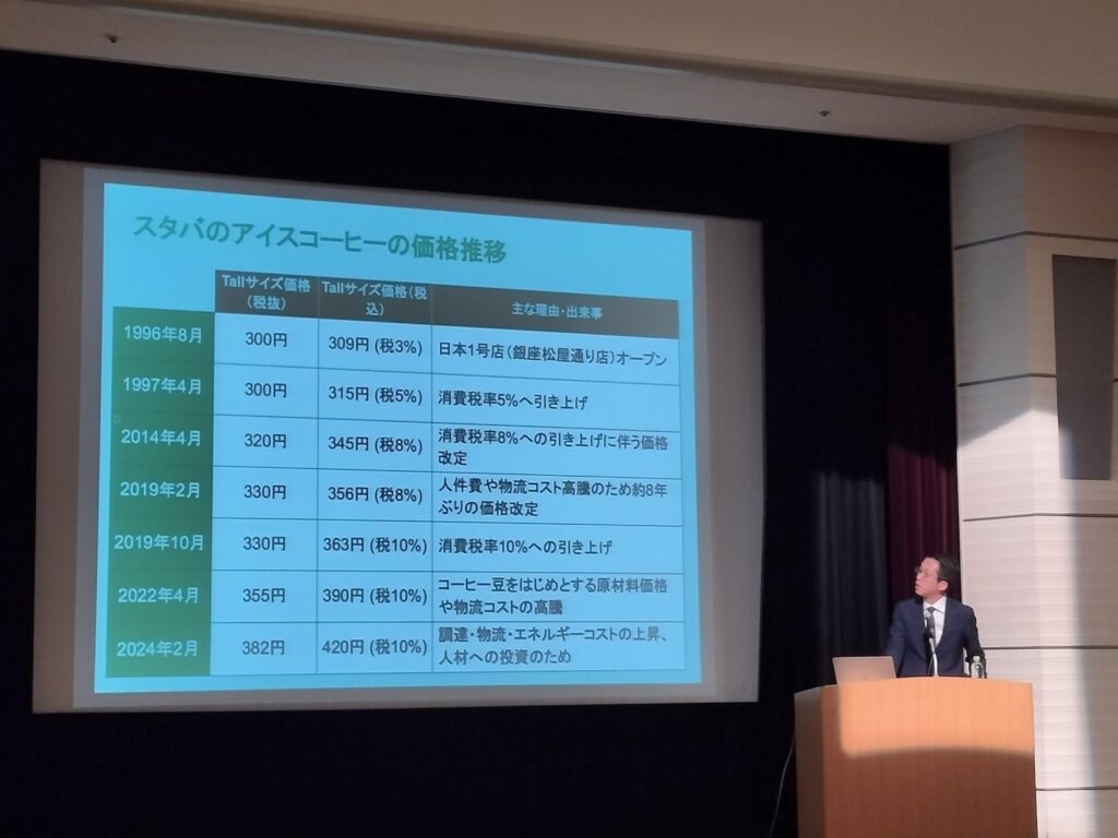 実際に、スターバックスのコーヒー価格の推移を事例に、インフレ状況下においては「何もしないことがリスク」であることを語ってくれました。