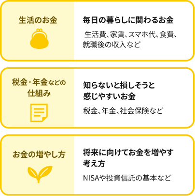 3つに分類したお金について、どれから学ぶべきかに決まった順番はありません。生活環境やバイトの状況、将来のイメージは人それぞれだからです。