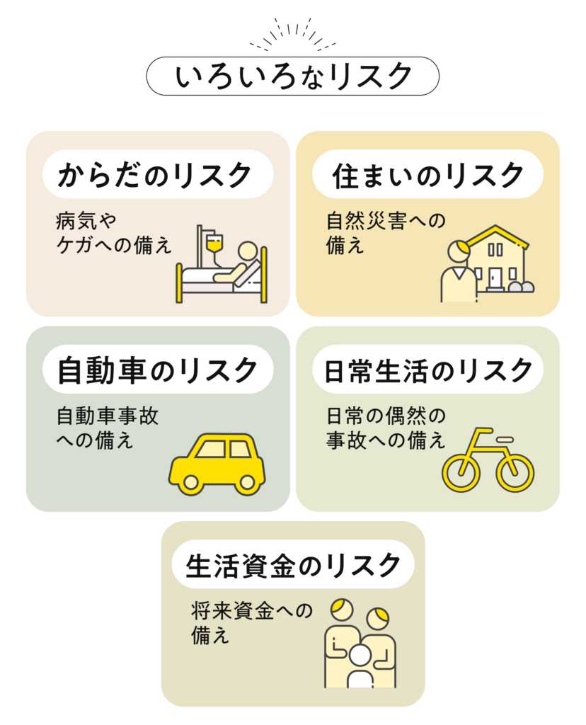 人生には誰もが直面する可能性のある、大きなリスクがいくつか存在します。健康・災害・事故の3つは特に影響が大きく、若いうちから対策を備えておくべきリスクです。