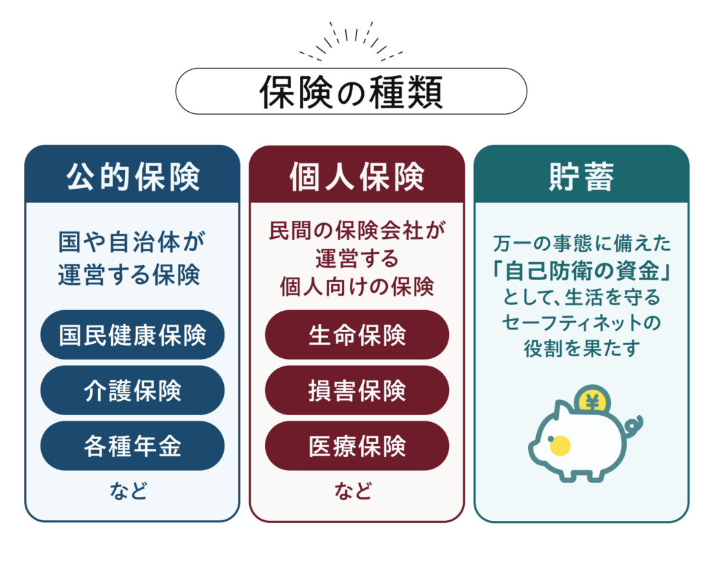 備え方の基本は「公的保険」「民間保険」「貯蓄」の3つです。これらを組み合わせることで、さまざまなリスクに対応できます。